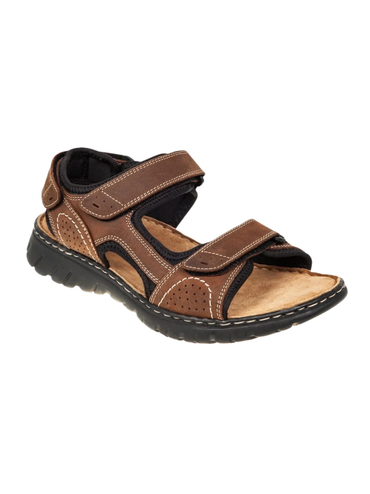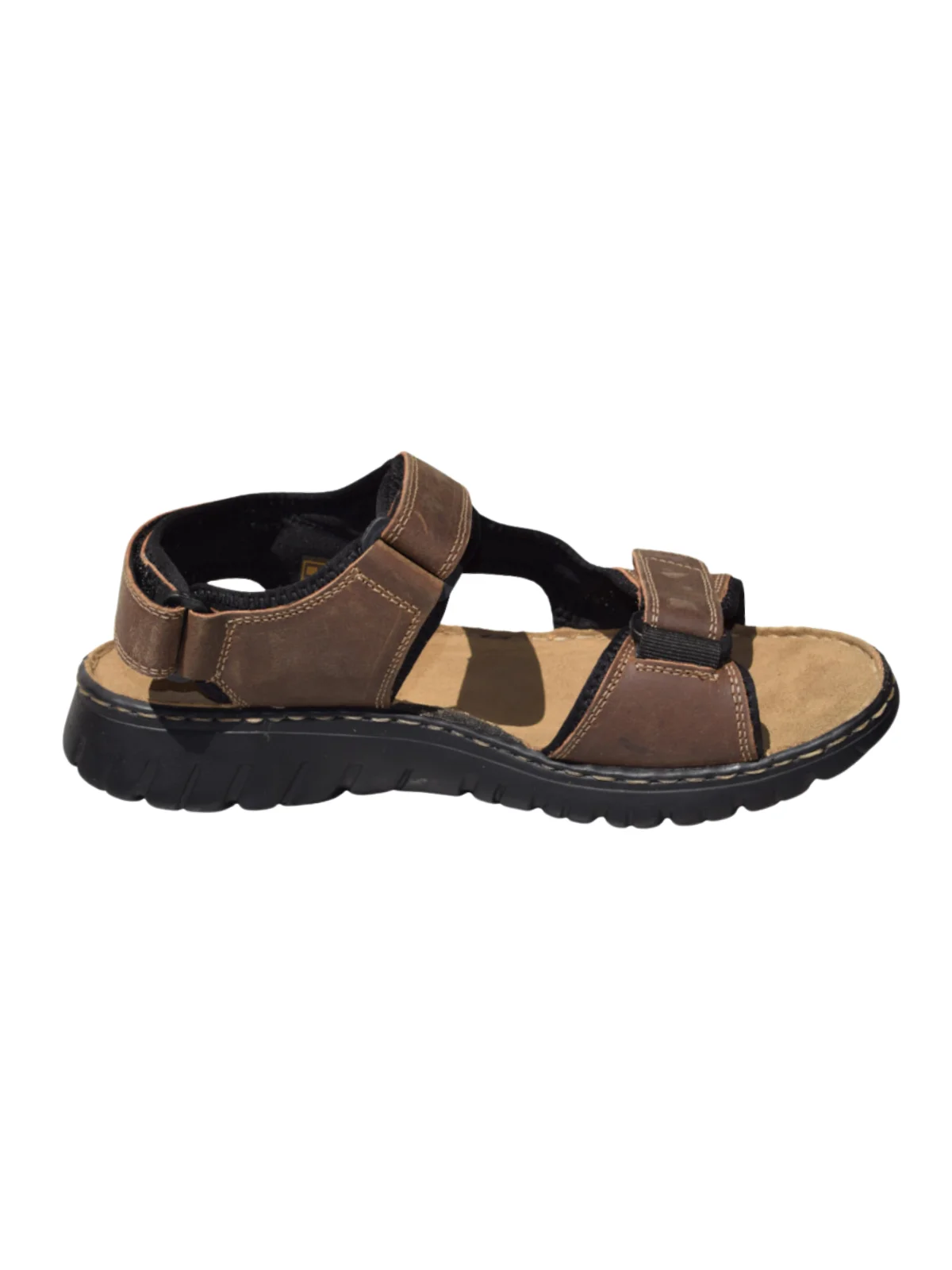 Men's leather sandals from Adam's Shoes. They have an anatomically shaped leather sole, two straps that open and close and adjust to each foot, and a non-slip sole that absorbs shock and helps with a more stable gait.