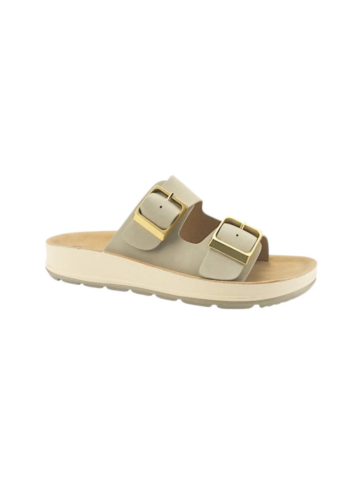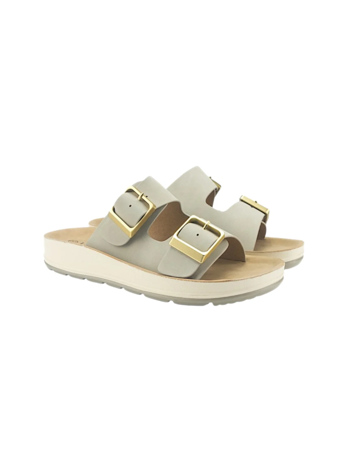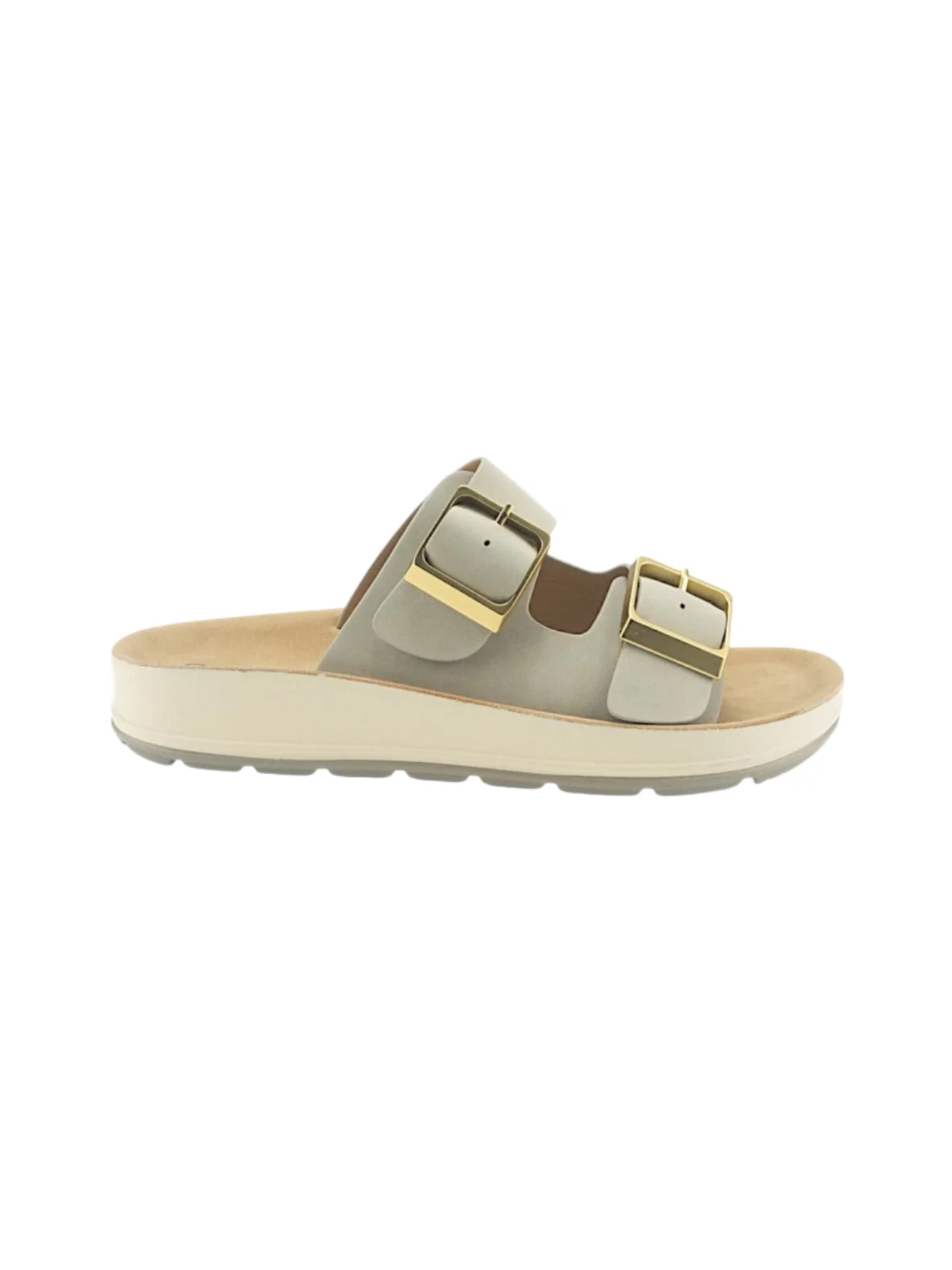 Γυναικείο σανδάλι σε γκρι χρώμα, είναι κατασκευασμένο από συνθετικό δέρμα που το καθιστά πολύ άνετο και πολύ μαλακό. Το ύψος του τακουνιού είναι 3 εκ.