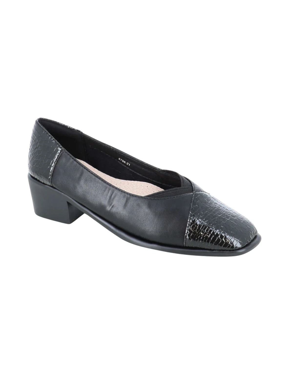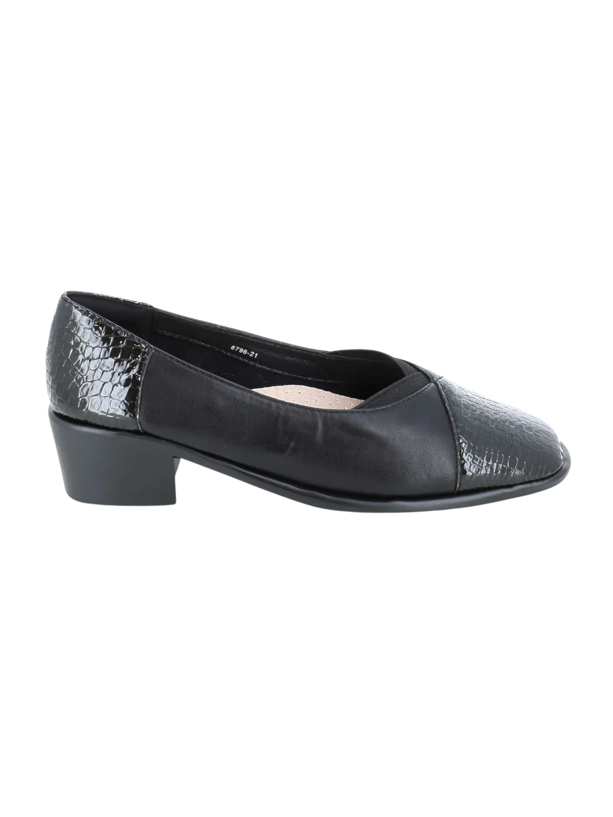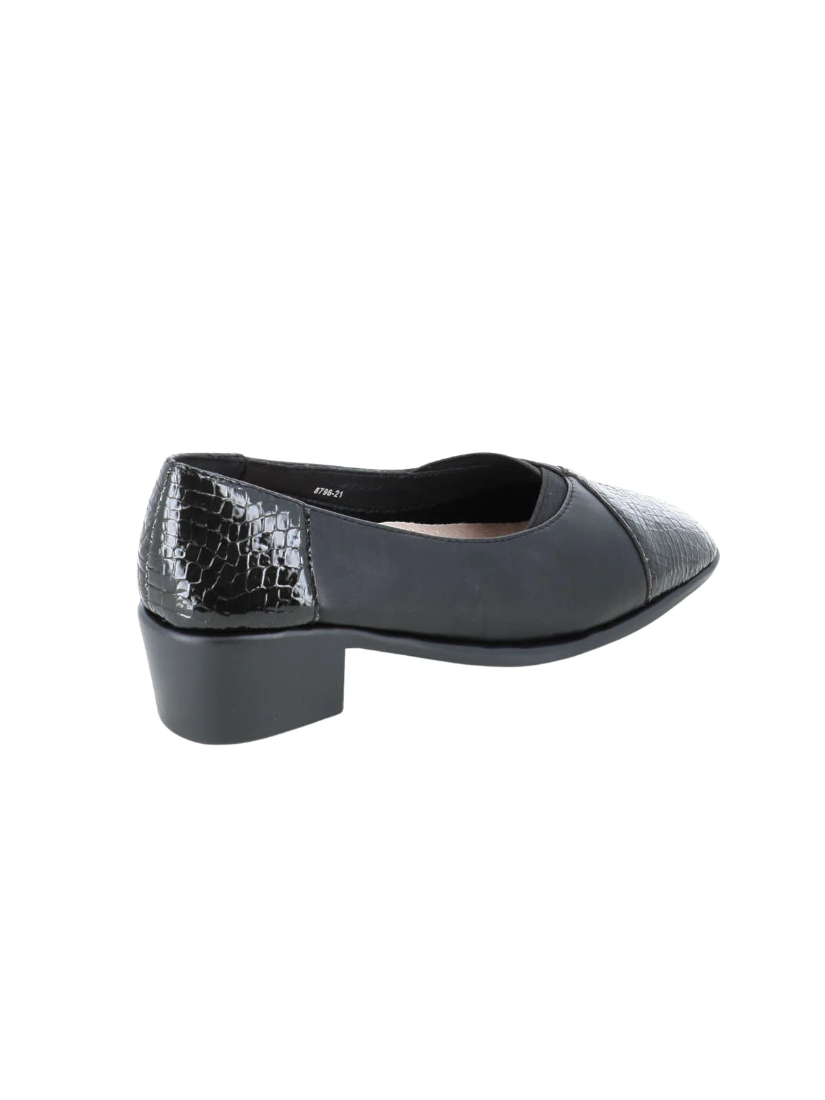 Γυναικείες γόβες με χαμηλό τακούνι για να σας συνοδεύουν όλη την ημέρα. Με croco/λουστρίνι σχέδιο στο μπροστινό και πίσω μέρος Διαθέτουν ιδιαίτερα μαλακό πάτο και αντιολισθητική σόλα.