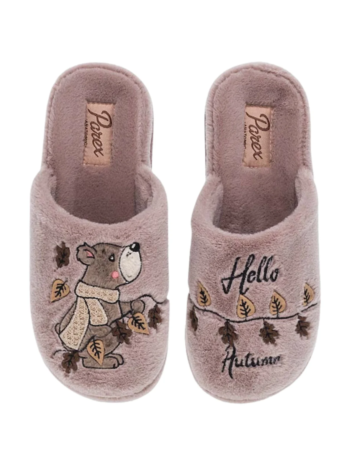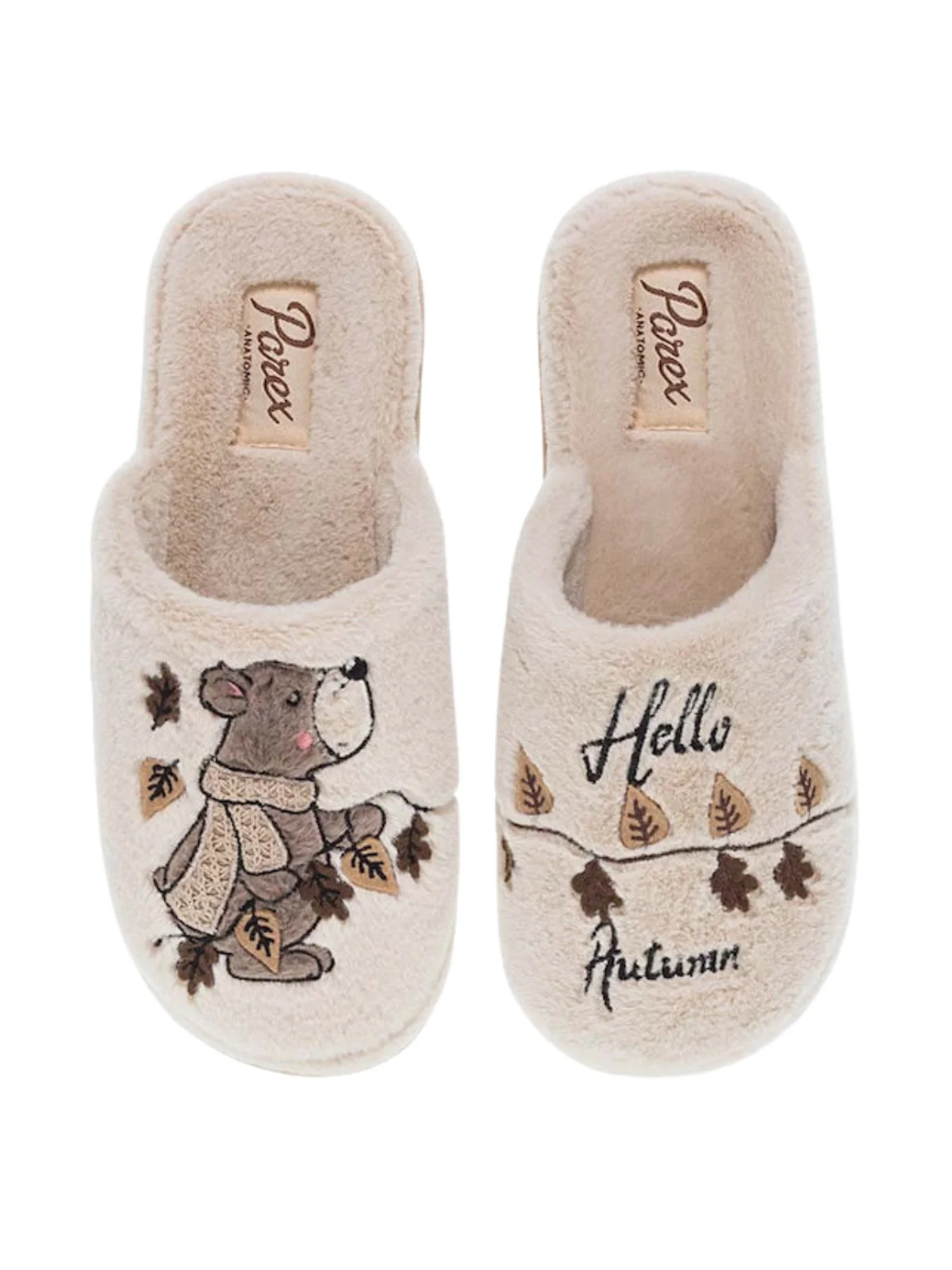 Γυναικείες παντόφλες σπιτιού Parex. Γυναικείες παντόφλες σπιτιού Parex με παιχνιδιάρικο σχέδιο αρκουδάκι και το μήνυμα Hello Autumn. Διαθέσιμες σε μπεζ και πούρο, χαρίζουν απόλυτη απαλότητα και άνεση, κρατώντας τα πόδια ζεστά και χαρούμενα κάθε στιγμή.