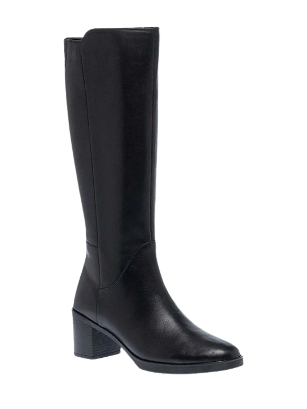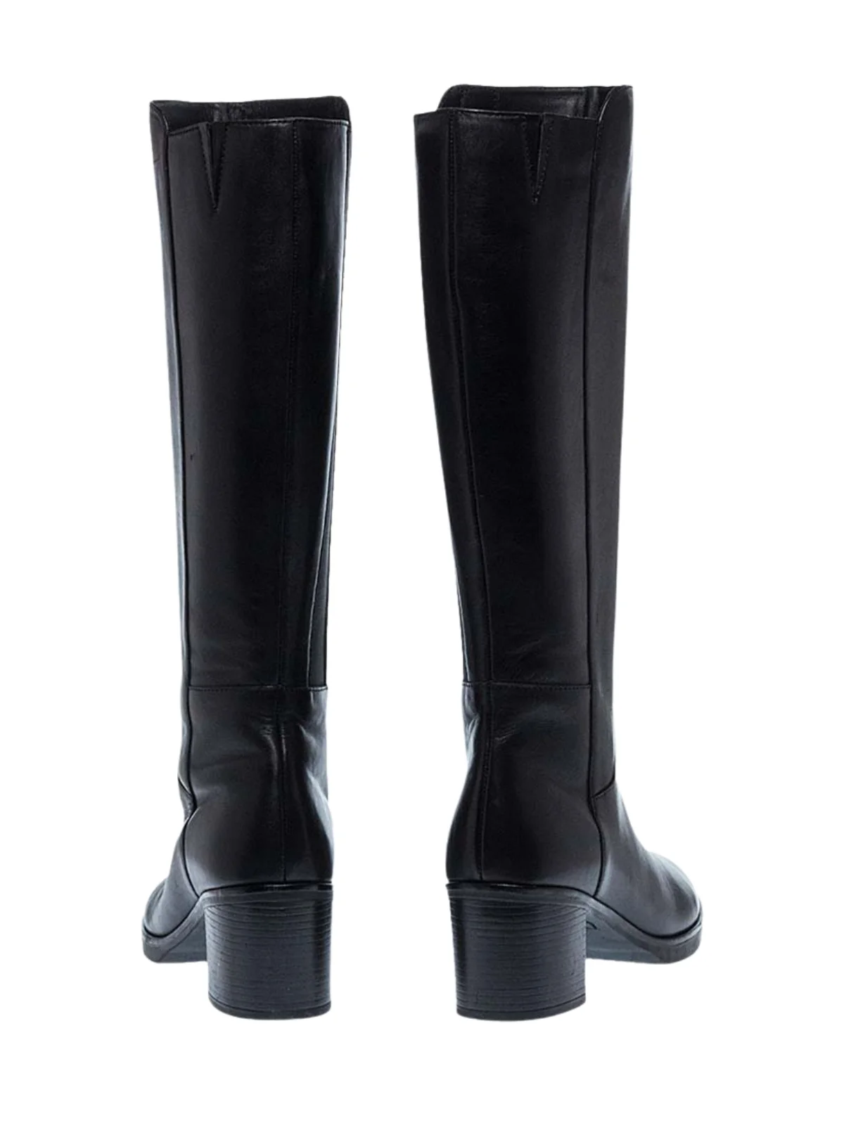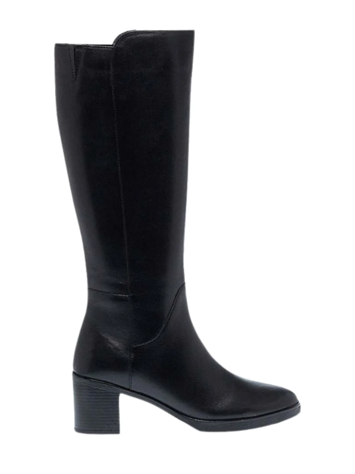 Γυναικείες δερμάτινες μπότες Parex. Κλασικές γυναικείες ψηλές μπότες σε μαύρο και καφέ χρώμα από δέρμα. Οι μπότες διαθέτουν φερμουάρ στο πλάι και χαμηλό τακούνι, ιδανικές για κομψές εμφανίσεις τον χειμώνα.